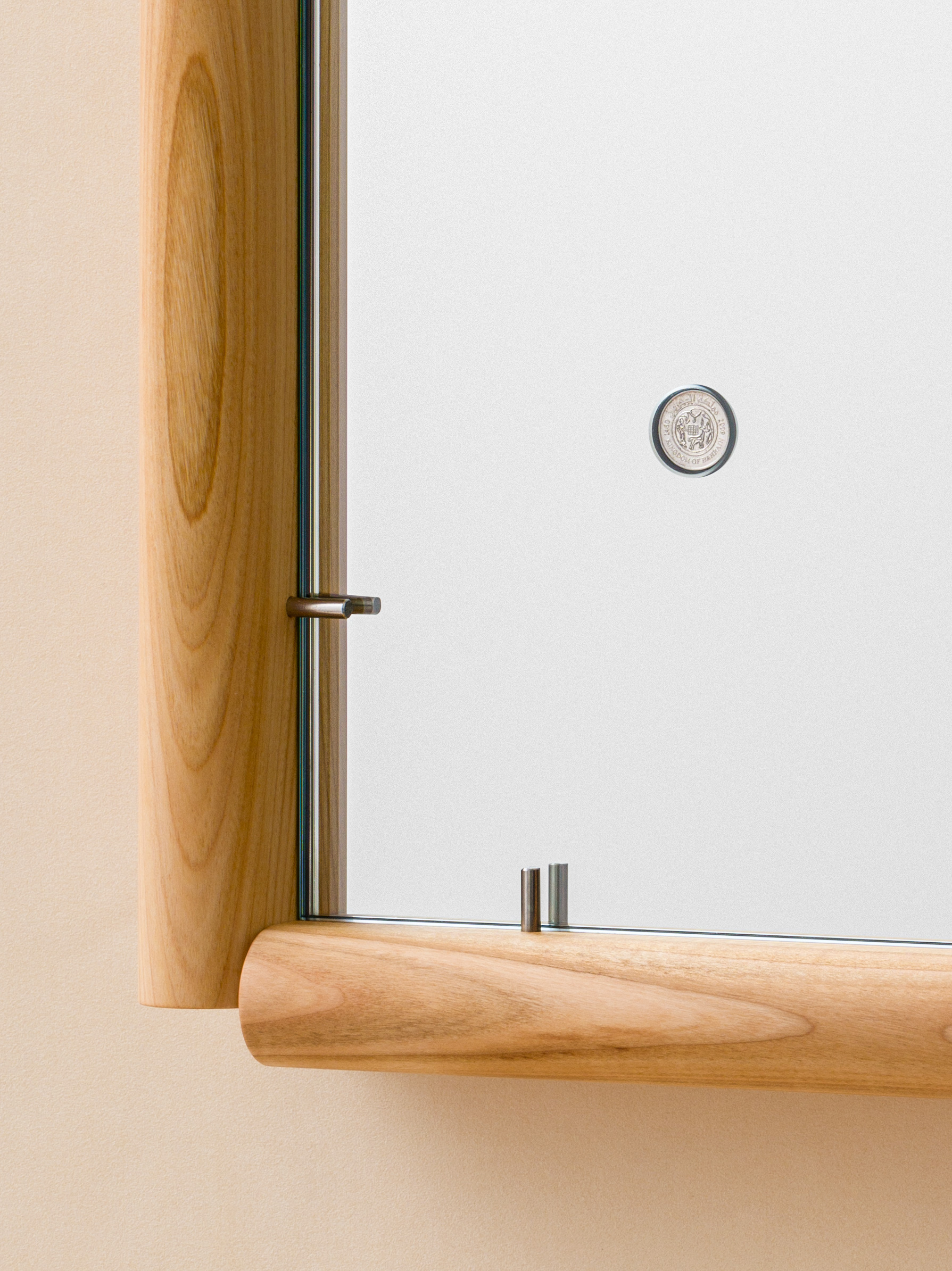 The limited edition mirror serves as a passe-partout with small round cutouts containing Bahraini coins. Beyond their miniature iconography and rich cultural value, the coins also tell tales that reflect the hands of the designers who brought them in front of you.