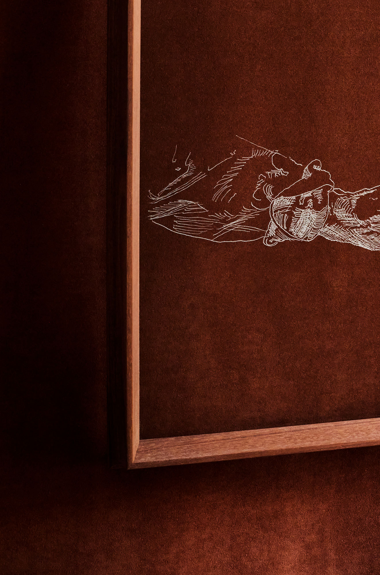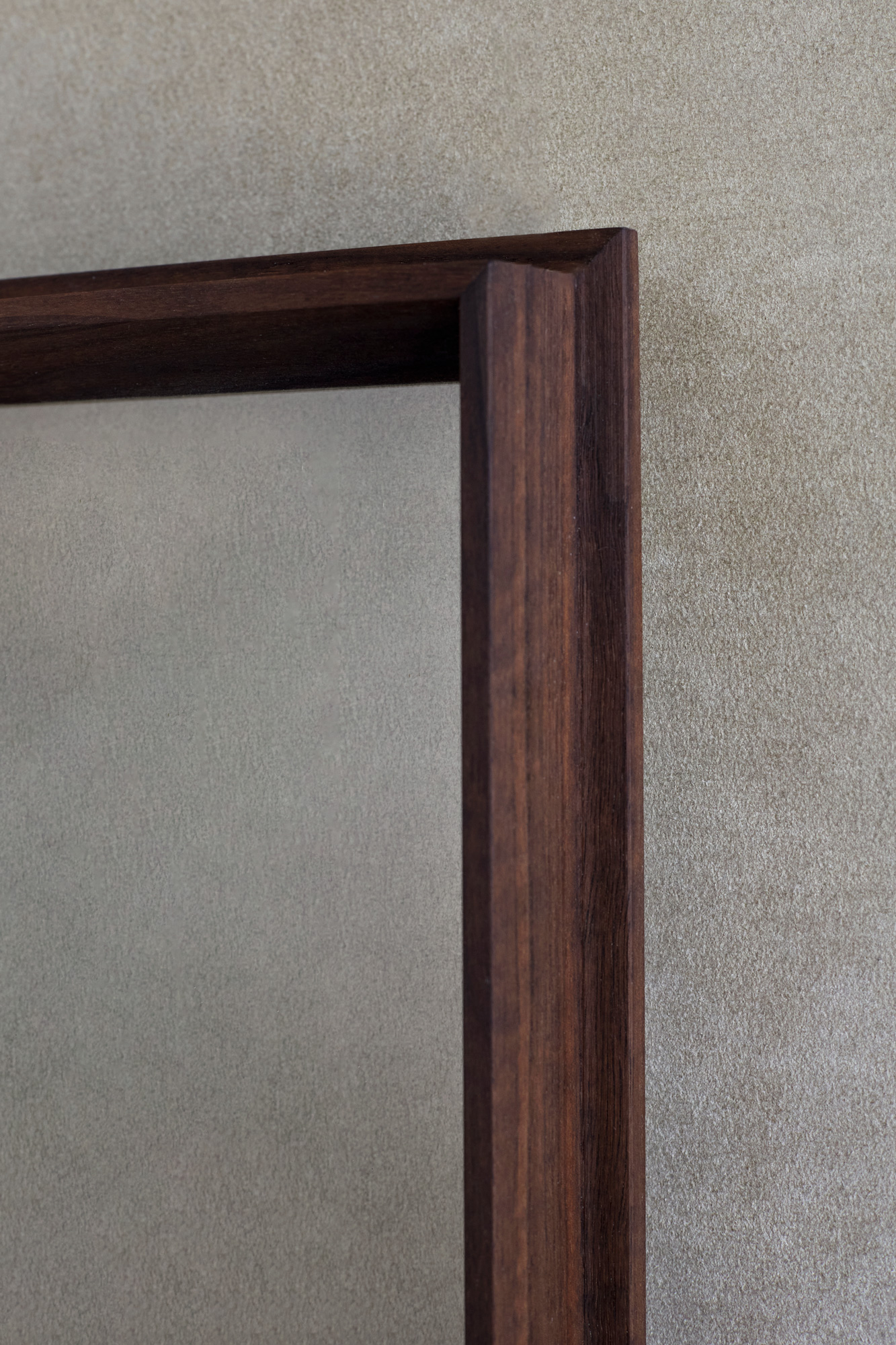The MO1 displays antique glass sheets with engravings of hands and flowers. There is a lightness to the MO1 profile that speaks to the improvised action of picking a flower next to an old pear or walnut tree where one imagines the wood for the frames comes from.