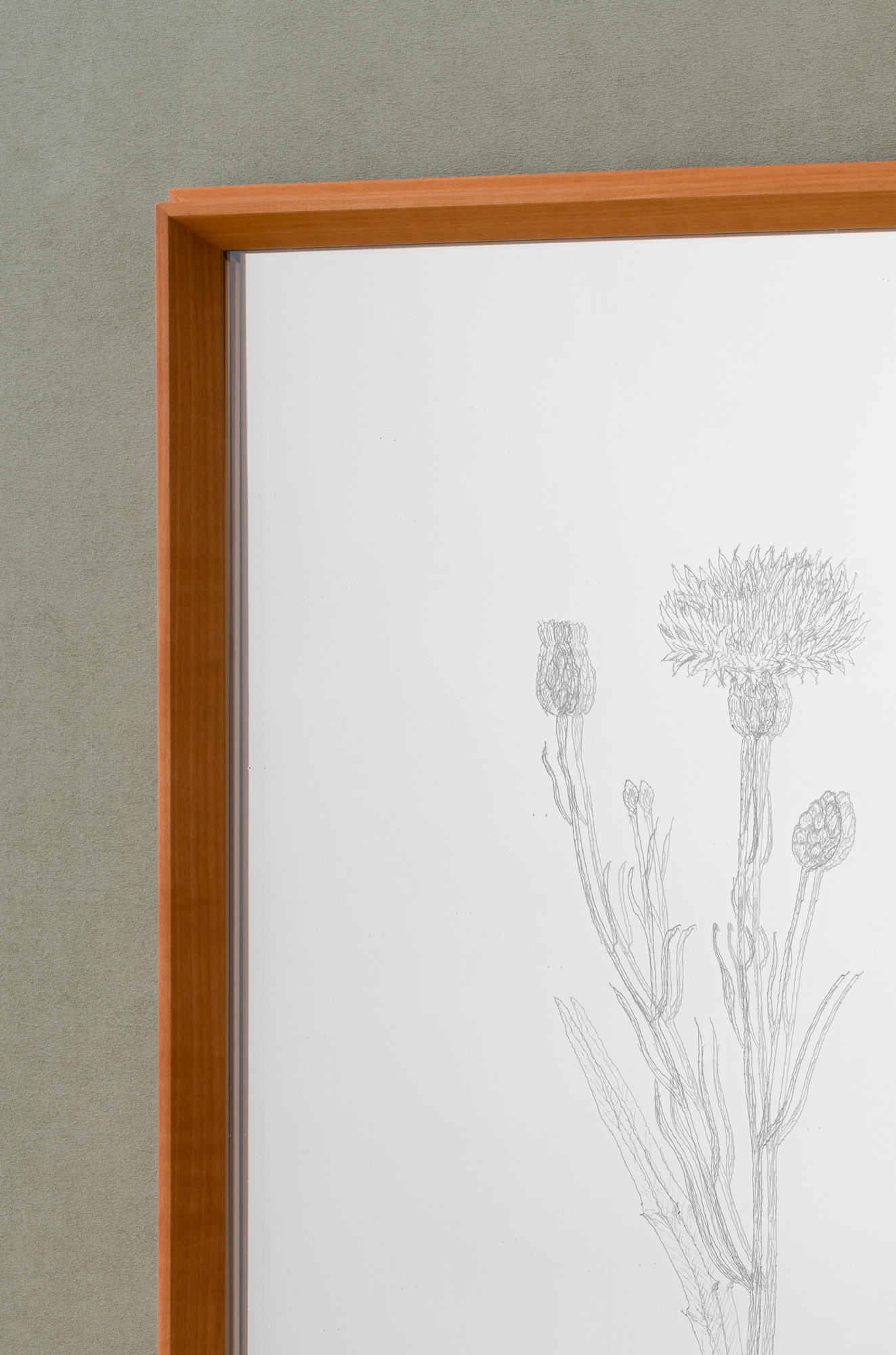 The MO1 displays antique glass sheets with engravings of hands and flowers. There is a lightness to the MO1 profile that speaks to the improvised action of picking a flower next to an old pear or walnut tree where one imagines the wood for the frames comes from.